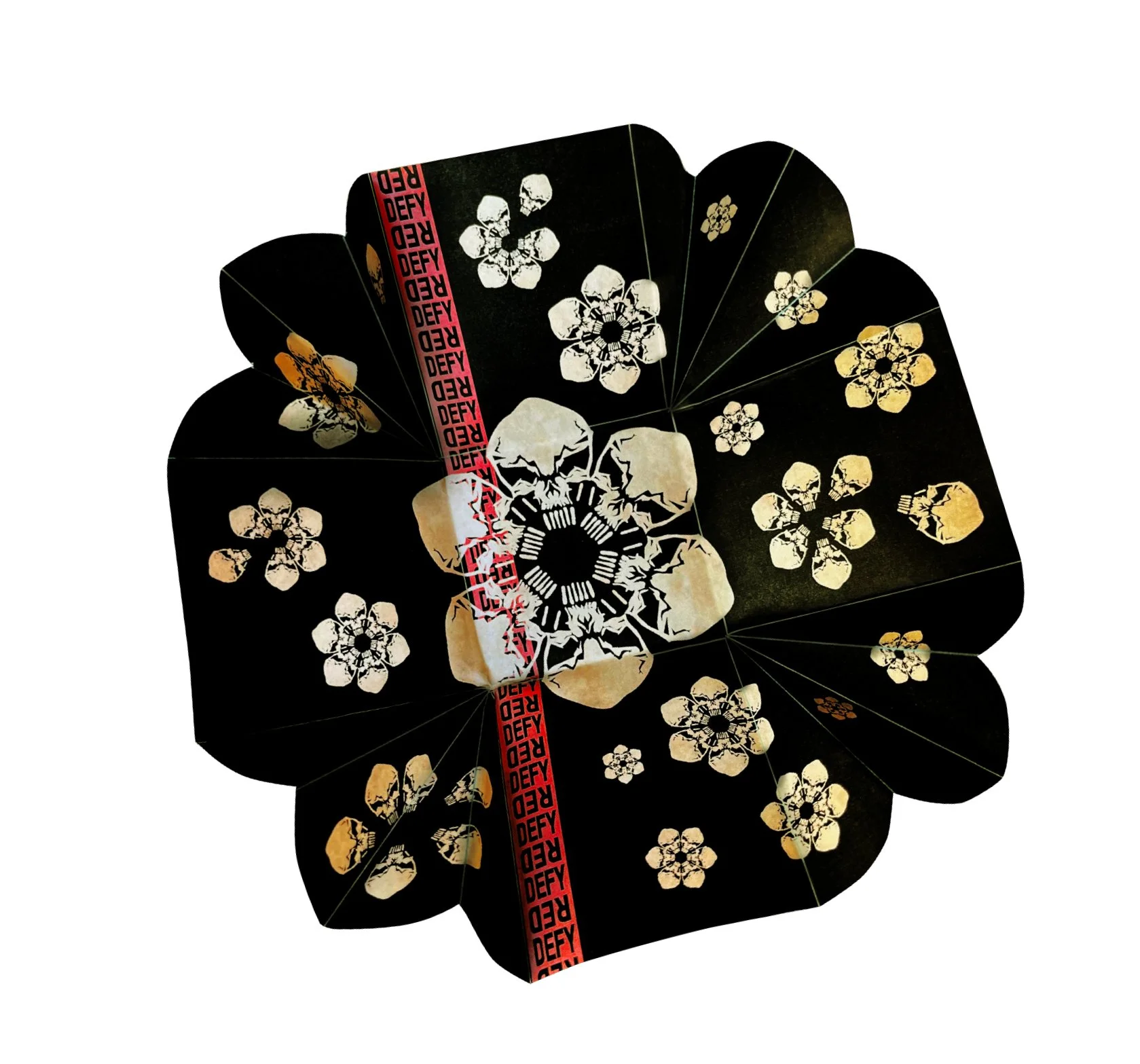 REDDEFY - This flower brand, under development, is meant to defy convention and REDdefine the way consumers purchase cannabis at retail using proprietary technology. When the outer lid of the box is lifted, the inner box is a decorative floral pattern made up of skulls (the defiance pattern), which unfolds into a rolling tray.